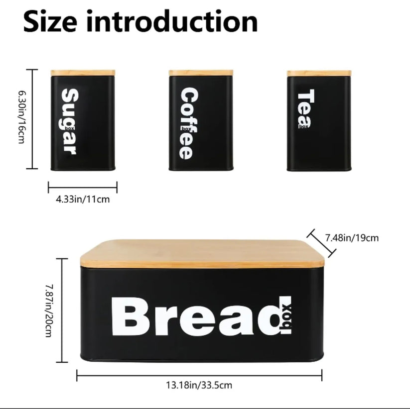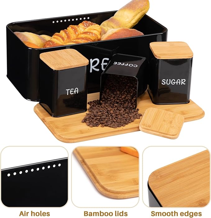 - Complete 4-Piece Set: Includes 1 large bread box and 3 labeled canisters for Tea, Coffee & Sugar.