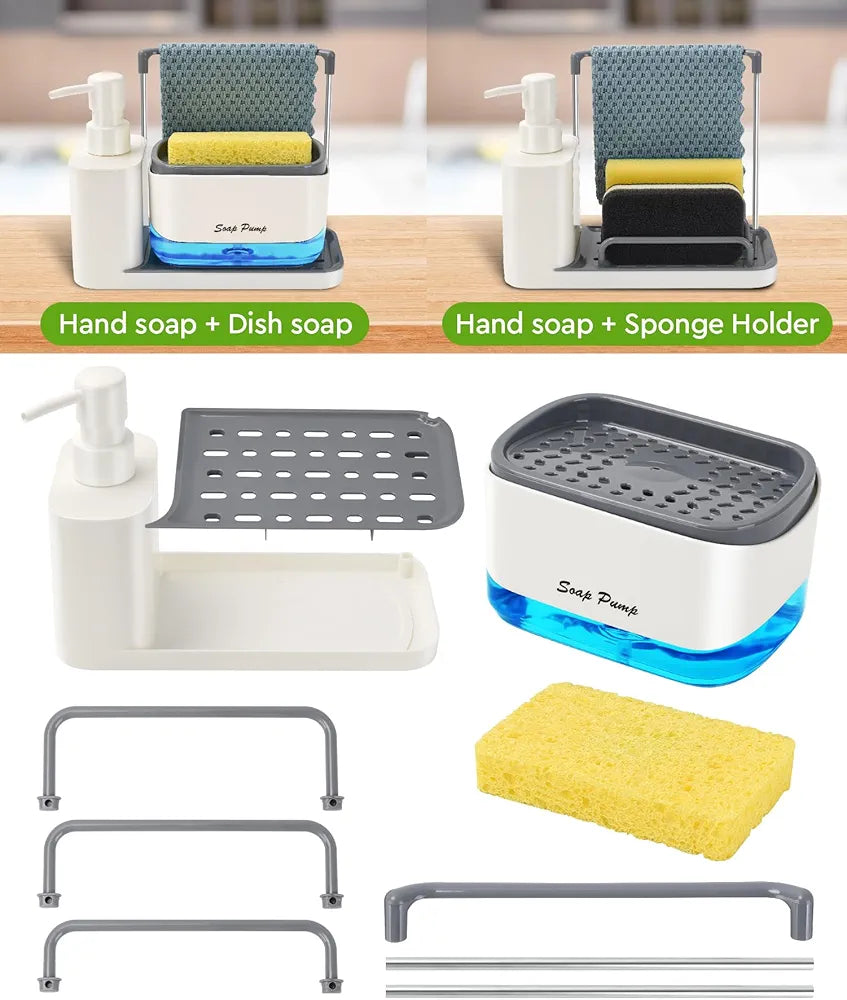 5-IN-1 PRATICAL COMBINATION: The simple and modern design incorporates a hand soap dispenser, drain tray, rags holder, which can be freely combined with the separate soap dispenser with sponge holder. A wider hanging bar makes the washcloths dry quickly, Keep kitchen countertops dry and clean. This convenient design makes your kitchen cleaning work more efficient and enjoyable.