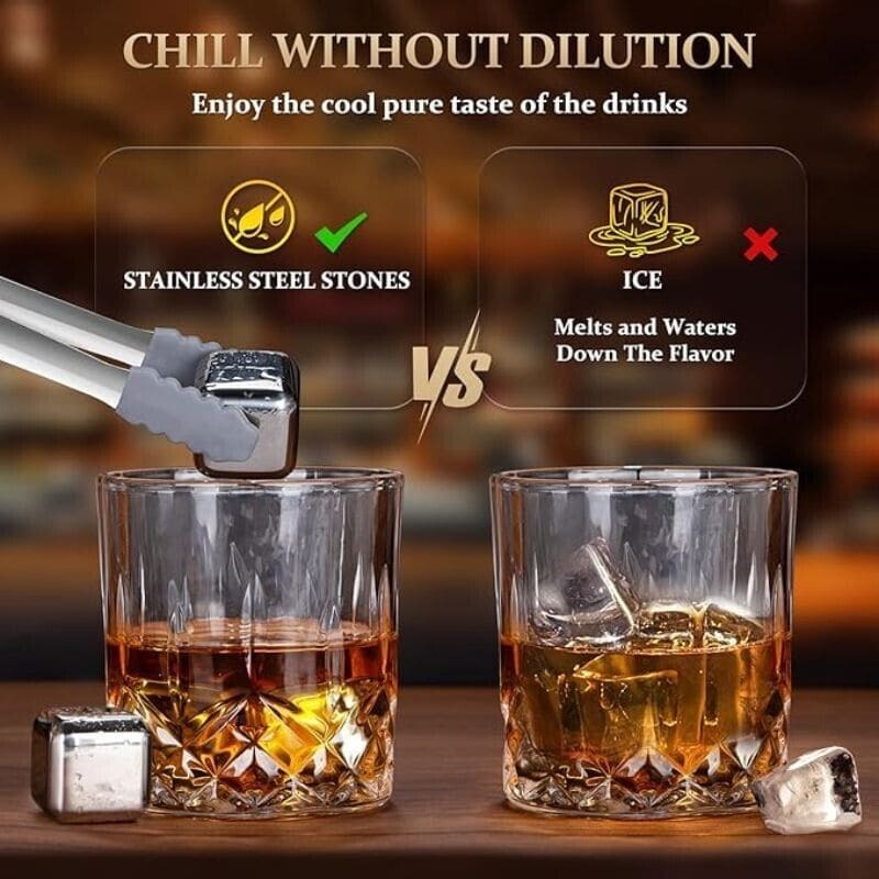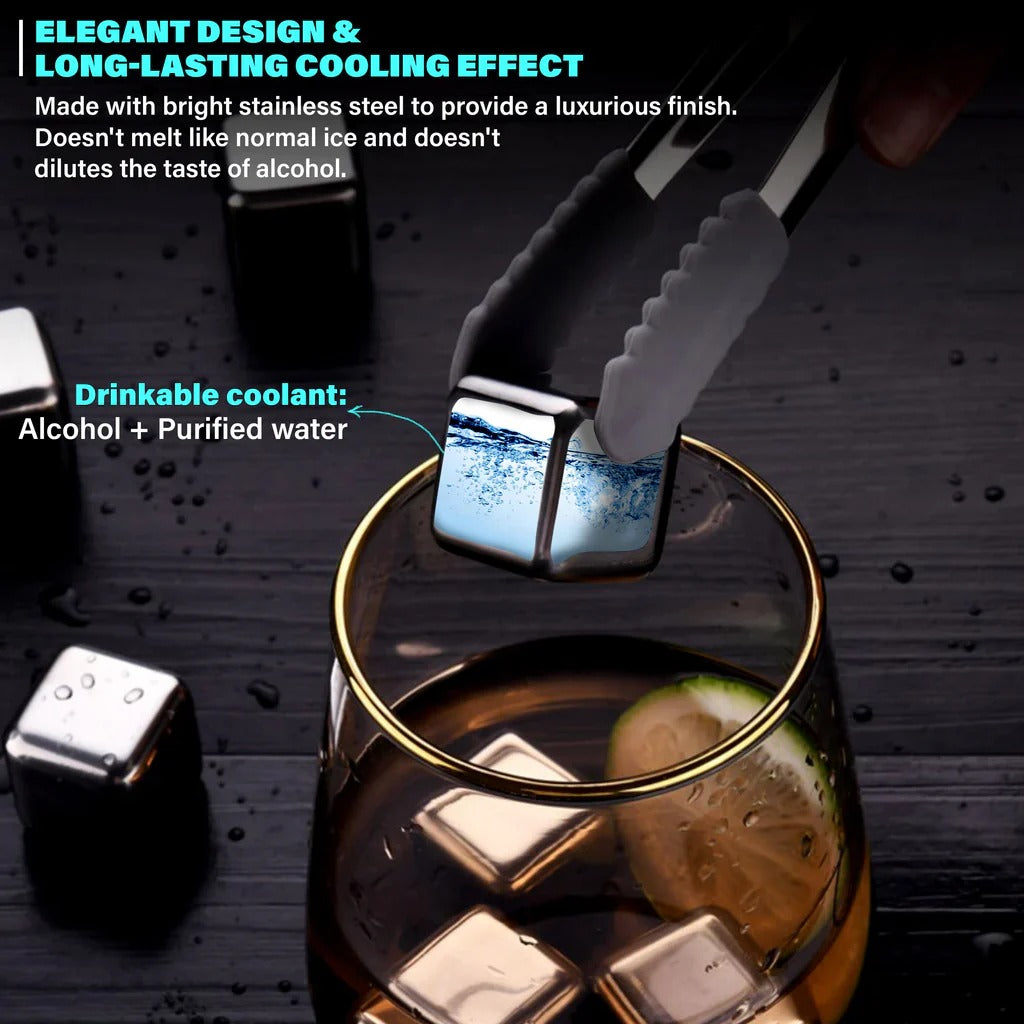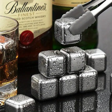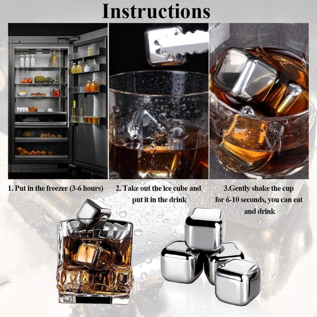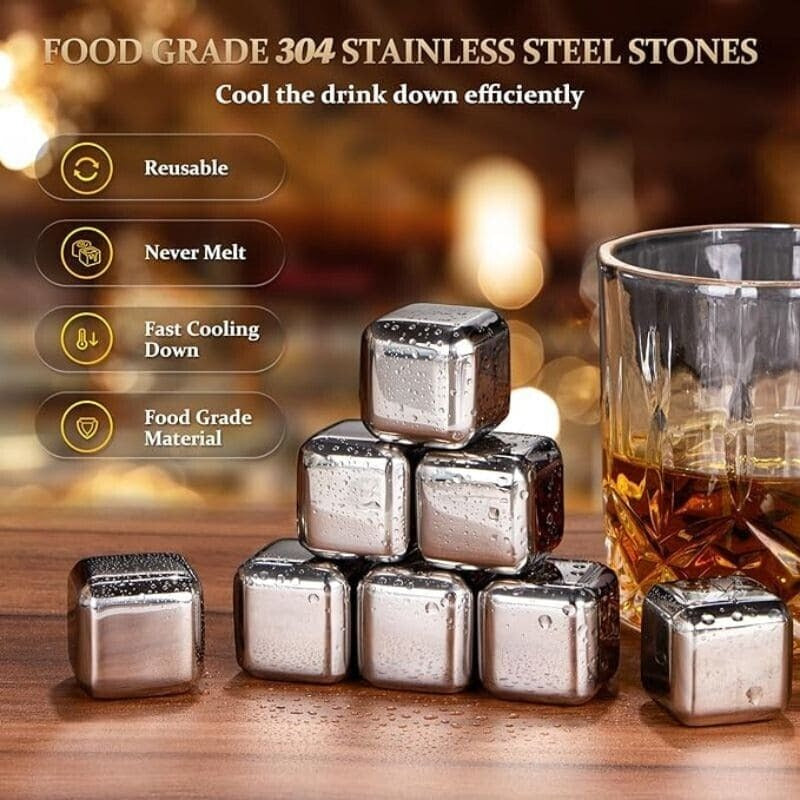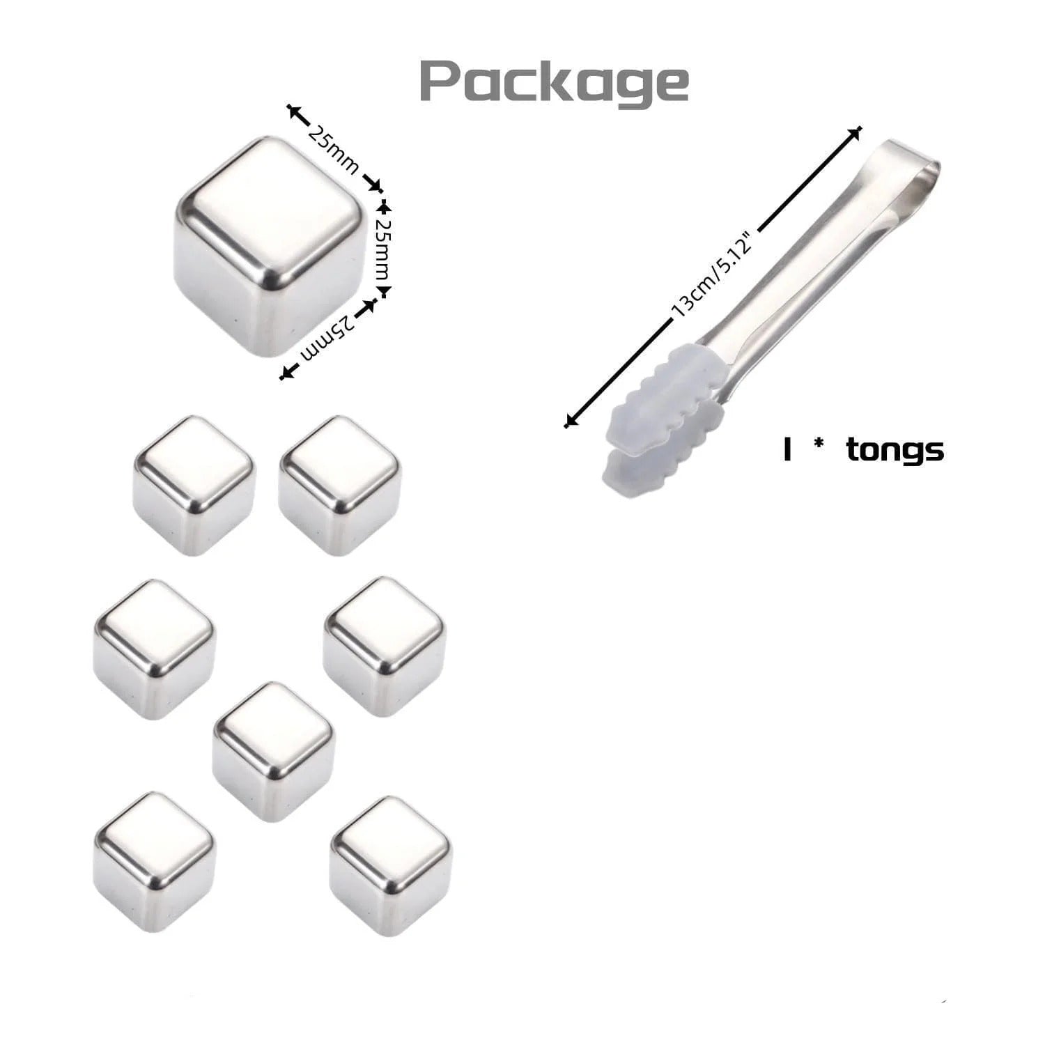 This drink cooler set contains non-melting ice cubes with a smooth surface that won't scratch your glasses or lips. The plastic storage ice box keeps the stainless steel ice clean while freezing and can be easily cleaned with water after use. Includes 06 packs of reusable square stainless steel ice cubes, anti-slip ice tongs with silicone and plastic sealable PP box. It also makes a great gift for men. It is made from stainless steel material that won't rust or corrode and that holds a cold temperature incredibly well, it will not affect your drink's flavor, whiskey rocks are durable, reusable, and safe to everyone. Rounded edges design will never scratch glassware or hit your teeth. It is perfect to cooling the beverage, like whiskey, beer, soda, coffee, juice, cocktails, it can also be be used for physical cooling, like fever reduction, cold compress, sprain, and swelling reduction.