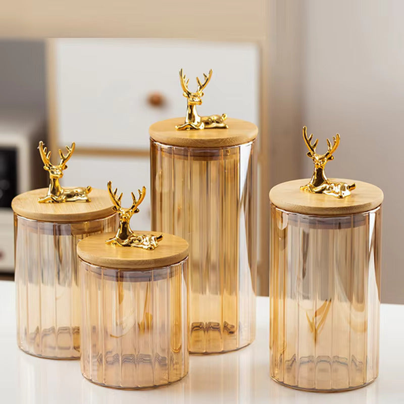 - Each canister features a beautiful ribbed glass body with a natural bamboo lid, topped with a stylish golden deer motif, making it an attractive addition to any kitchen decor.