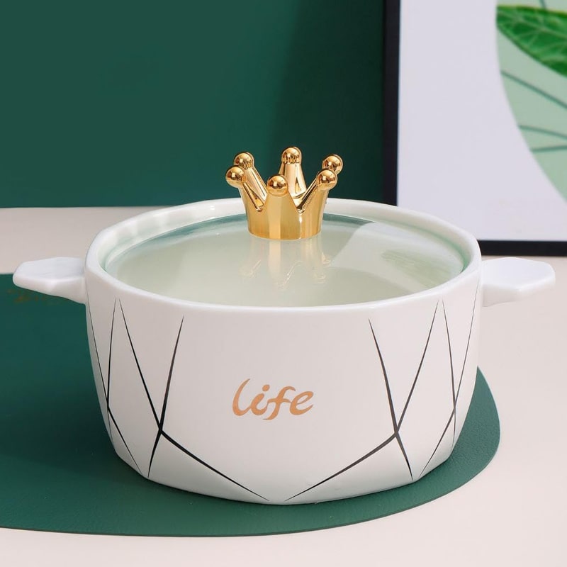 Elegant Ceramic Bowl with Crown Glass Lid – 1200ml