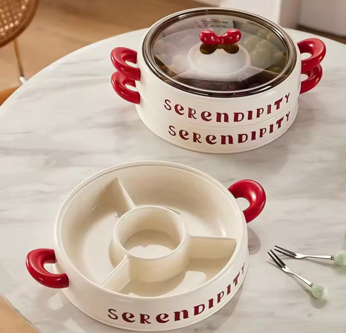 The Serendipity Divided Snack Tray is an elegant serving and storage solution designed to keep snacks fresh, organized, and beautifully displayed. With its signature bow-knot handle and clear dust-proof lid, it’s perfect for tea time, gatherings, or everyday countertop styling.