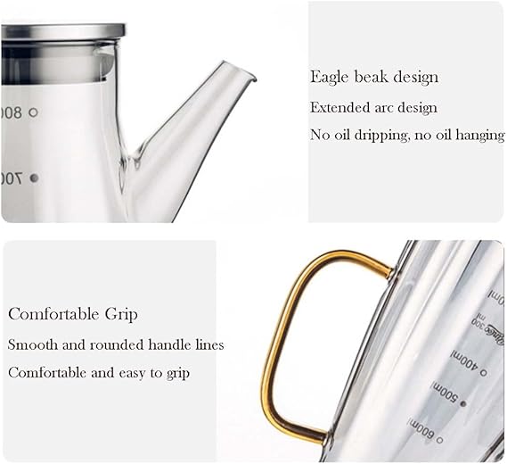 A stylish and practical glass oil dispenser featuring measurement markings, an ergonomic handle, and an anti-drip spout for clean, controlled pouring.