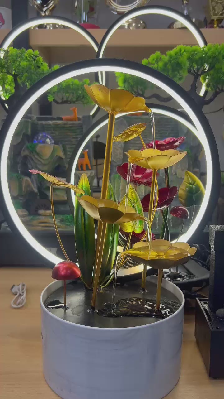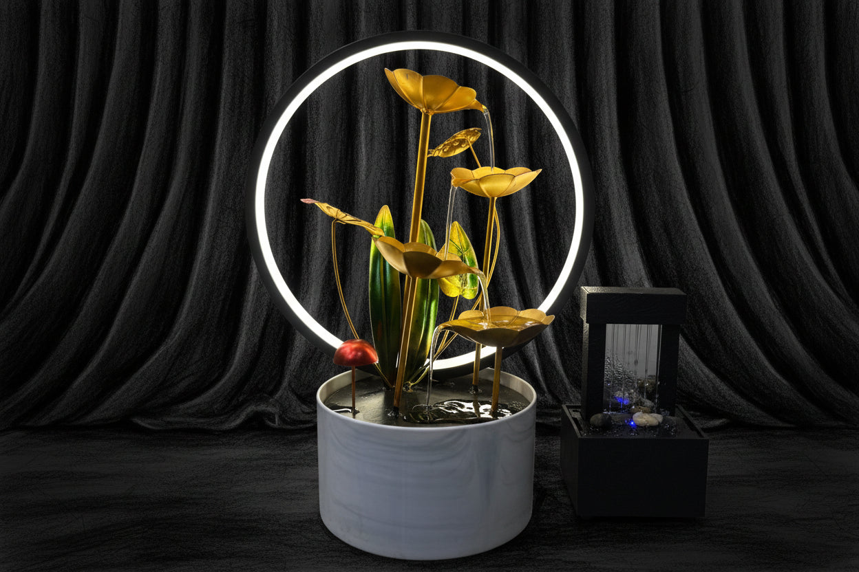 This premium tabletop fountain features cascading golden lotus flowers framed by a modern LED halo ring. Gentle water flow combined with warm lighting creates a peaceful ambiance—perfect for relaxation, meditation, or stylish home décor.