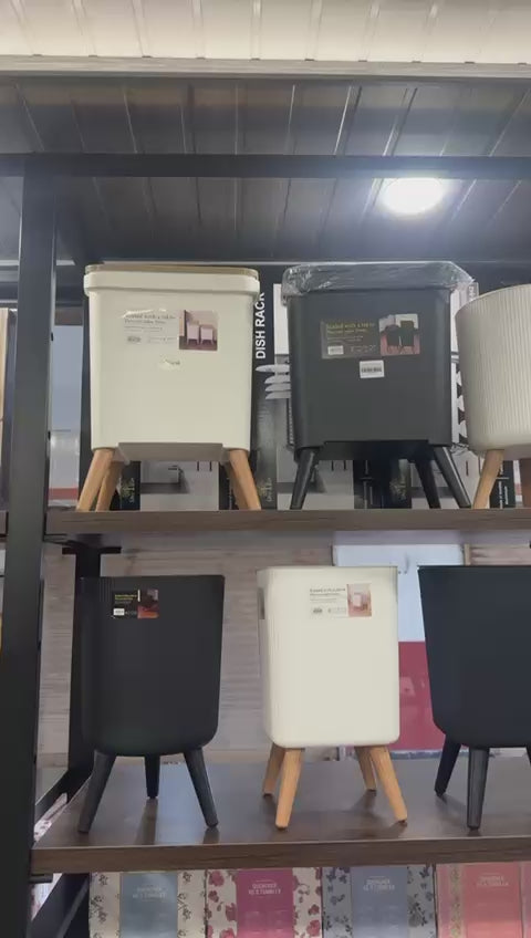 Upgrade your home organization with our sleek, Scandinavian-inspired storage bins. Designed for both style and function, these elevated bins feature stable wood-textured legs and a convenient push-to-open lid to keep your space tidy, hygienic, and odor-free.