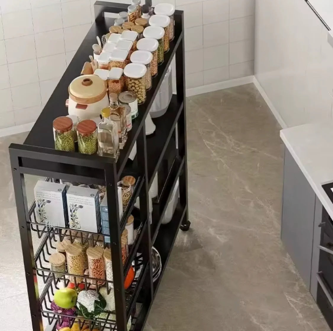 This multi layer storage rolling cart is a versatile and moveable kitchen organizer designed to maximize space and improve accessibility. Featuring multiple tiers with spacious baskets, it offers ample storage for fruits, vegetables, utensils, pantry items, and more. Its sturdy metal frame ensures durability, while the smooth-rolling wheels allow for easy mobility between rooms. Ideal for kitchens or laundry areas, this multifunctional rack combines practicality with modern design, making it a convenient solution for organizing everyday essentials in compact spaces.