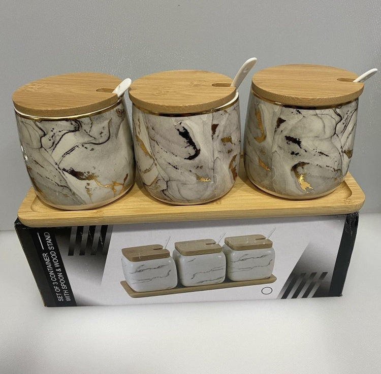 - Set Includes: 3 Ceramic Jars, 3 Bamboo Lids, 3 Ceramic Spoons, 1 Bamboo Tray