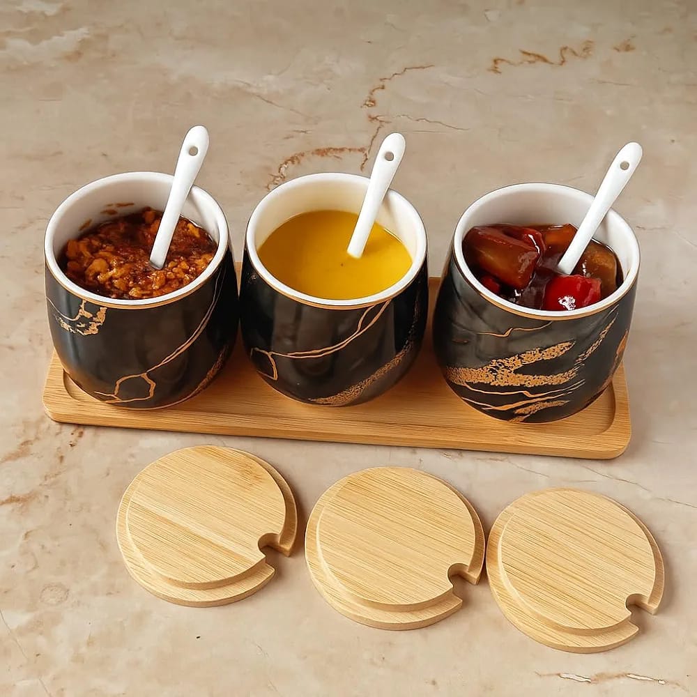 - Material: Premium Ceramic (jars & spoons), Natural Bamboo (lids & tray)