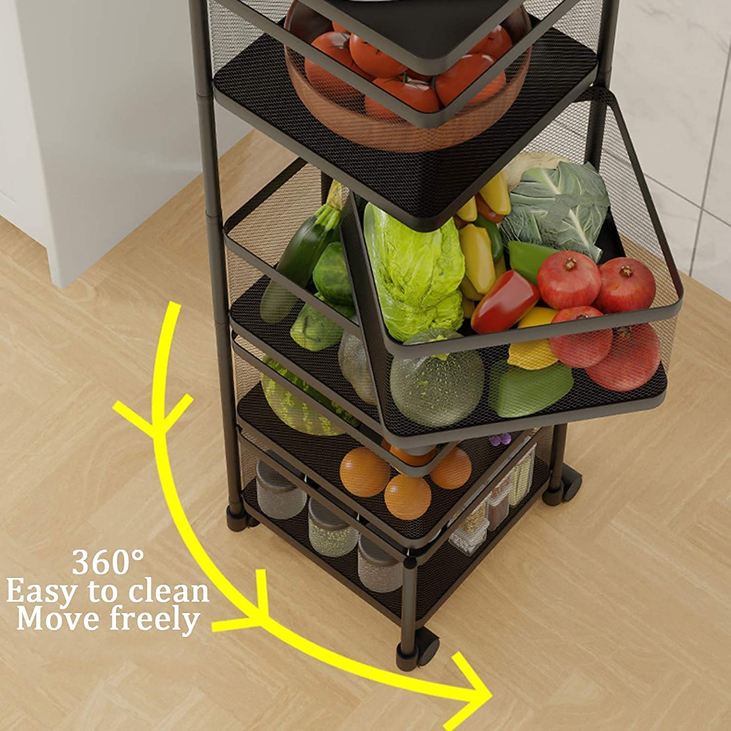 - Features multiple mesh baskets, perfect for organizing fruits, vegetables, pantry items, and kitchen supplies, keeping everything easily accessible.