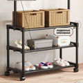 This all-in-one clothing rack features a sturdy hanging bar for garments and three lower shelves for shoes, boxes, or folded items. Its slim footprint makes it ideal for bedrooms, apartments, dressing areas, or laundry rooms.