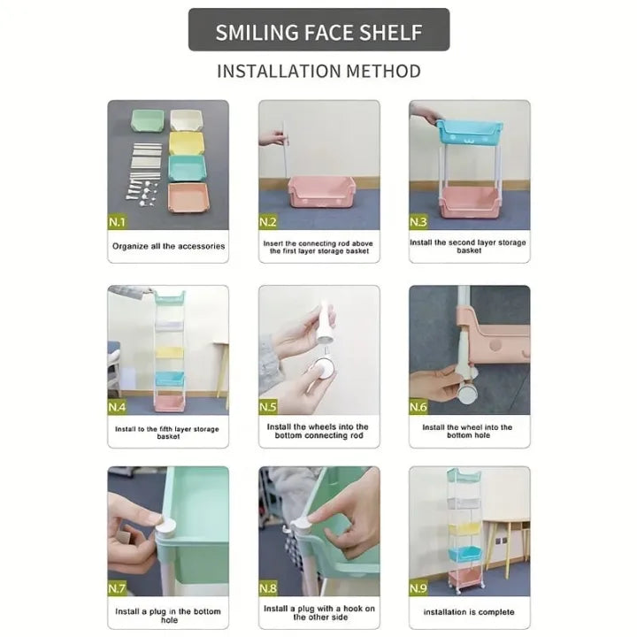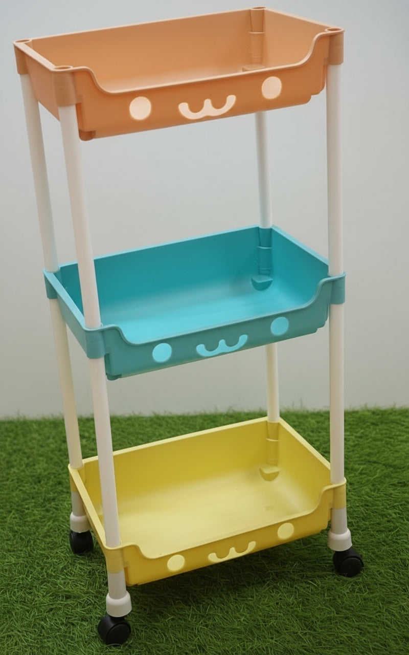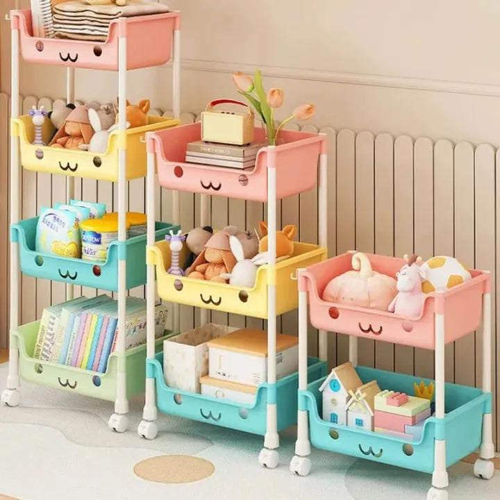 Made from durable, easy-to-clean plastic, this rolling organizer is ideal for toys, bathroom items, kitchen essentials, or nursery storage. Its mixed-color baskets and smiling face design make it both practical and charming.