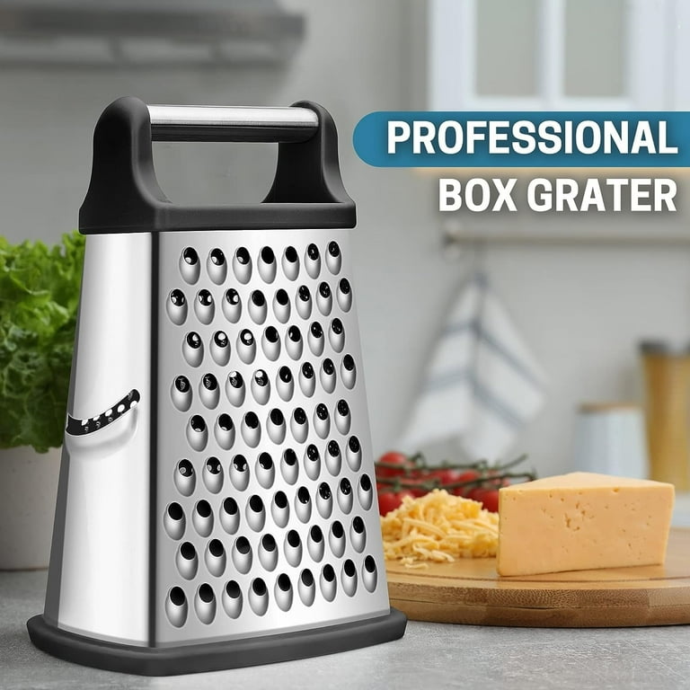 A premium 4-sided stainless steel box grater designed for fast, safe, and versatile food prep. Available in Small, Medium, and Large (XL) sizes with a sturdy black handle and non-slip base.