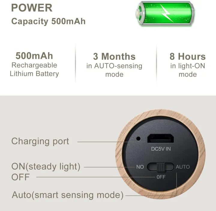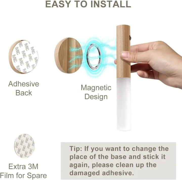 A stylish, modern night light featuring a natural wooden base and smart motion-sensing technology—perfect for bedrooms, hallways, stairs, and closets.